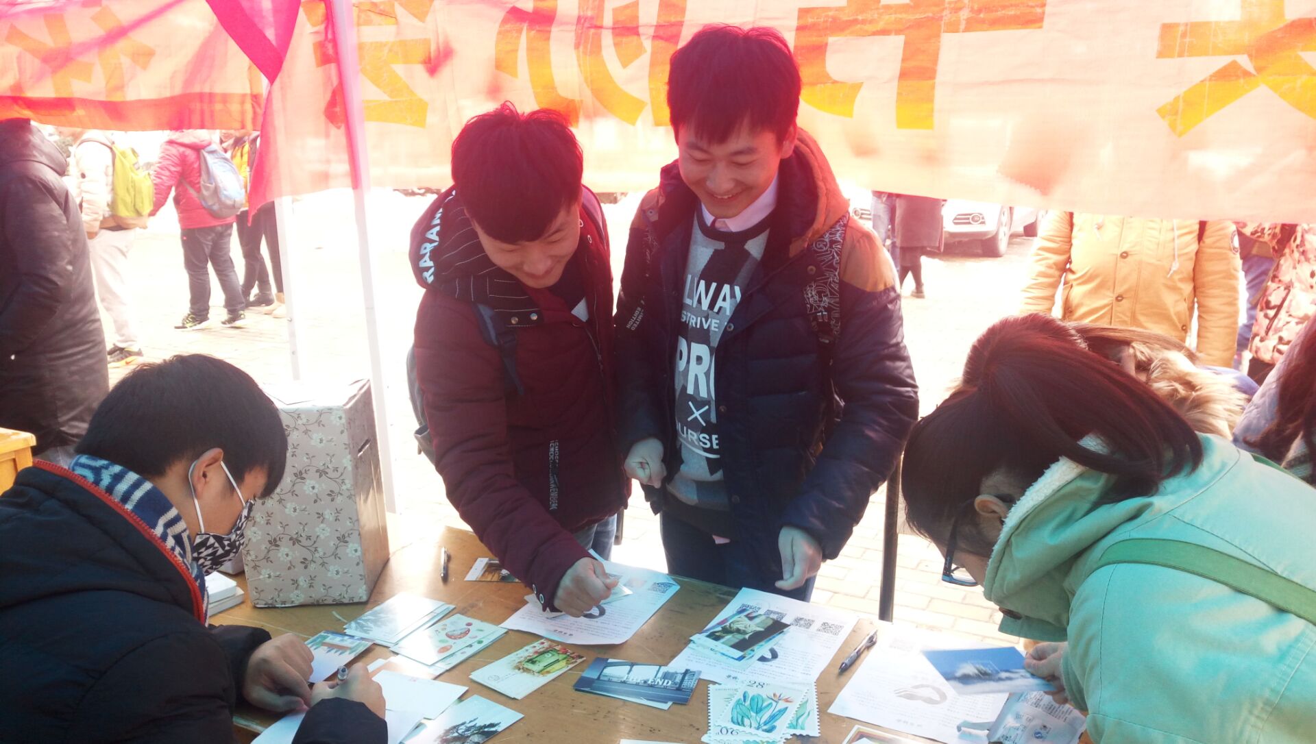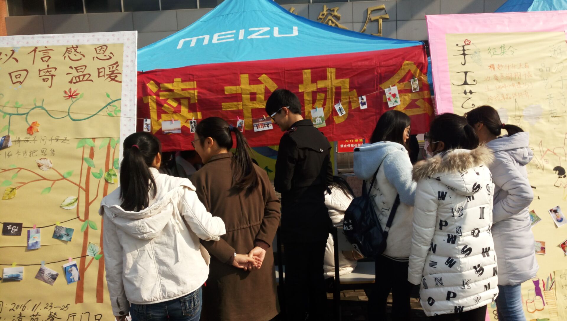 11月23日,由大学生社团联会主办,读书协会承办的“以信感恩,回寄温暖”为主题的社团潮活动在清苑餐厅门前举行。当今大学生大多出身在宽裕的家庭环境中,很多人在享受幸福的同时却不懂得珍惜和感恩,认为自己所拥有的一切都是理所当然的。为了强化当代大学生的感恩意识,读书协会特在感恩节前后举办此次活动,提醒大家要怀有一颗感恩的心,感恩他人,回寄温暖。参加本次活动的有读书协会15级和16级全体成员。 23日上午协会成员陆续到达活动现场,在会长资芮的带领了进行前期的准备工作。活动宣传板上写着“亲恩、师恩、友恩,恩情永存”,很好地契合“感恩节明信片回寄温暖”这一主题。准备工作做好后,协会成员们展开分工,活动拉开序幕,成员们在一旁耐心为同学们介绍此次活动参与方式,号召他们通过书写明信片的方式,抒发自己对身边人的感恩之情。很多同学对此表示出浓厚的兴趣,来到展台处挑选心仪的明信片,有些同学在现场就写好了明信片,交予协会成员帮忙寄出。活动高潮时期,展台一度被前来挑选明信片的同学围住水泄不通。受到这分温情的感染,所有人的脸庞上都露出灿烂的笑容。鉴于同学们对此次活动的大力支持,本次活动持续开展了两天,于25日下午落下帷幕,协会成员合影留念,由会长资芮做活动总结,本次活动圆满结束。 经工作人员统计,在此次活动中同学们共写了400多张明信片,一张张明信片,书写着大家对亲人、老师及同学的感情,见证了每位学子感恩的心。此次活动以感恩节为契机,通过寄送明信片来表达这份感恩之心,不仅促进了同学们之间的交流,增强了协会成员的凝聚力,而且激发了他们对生活的热爱,让暖意洋洋的祝福在学校的上空架起了一座爱的桥梁,传递着满满的正能量。