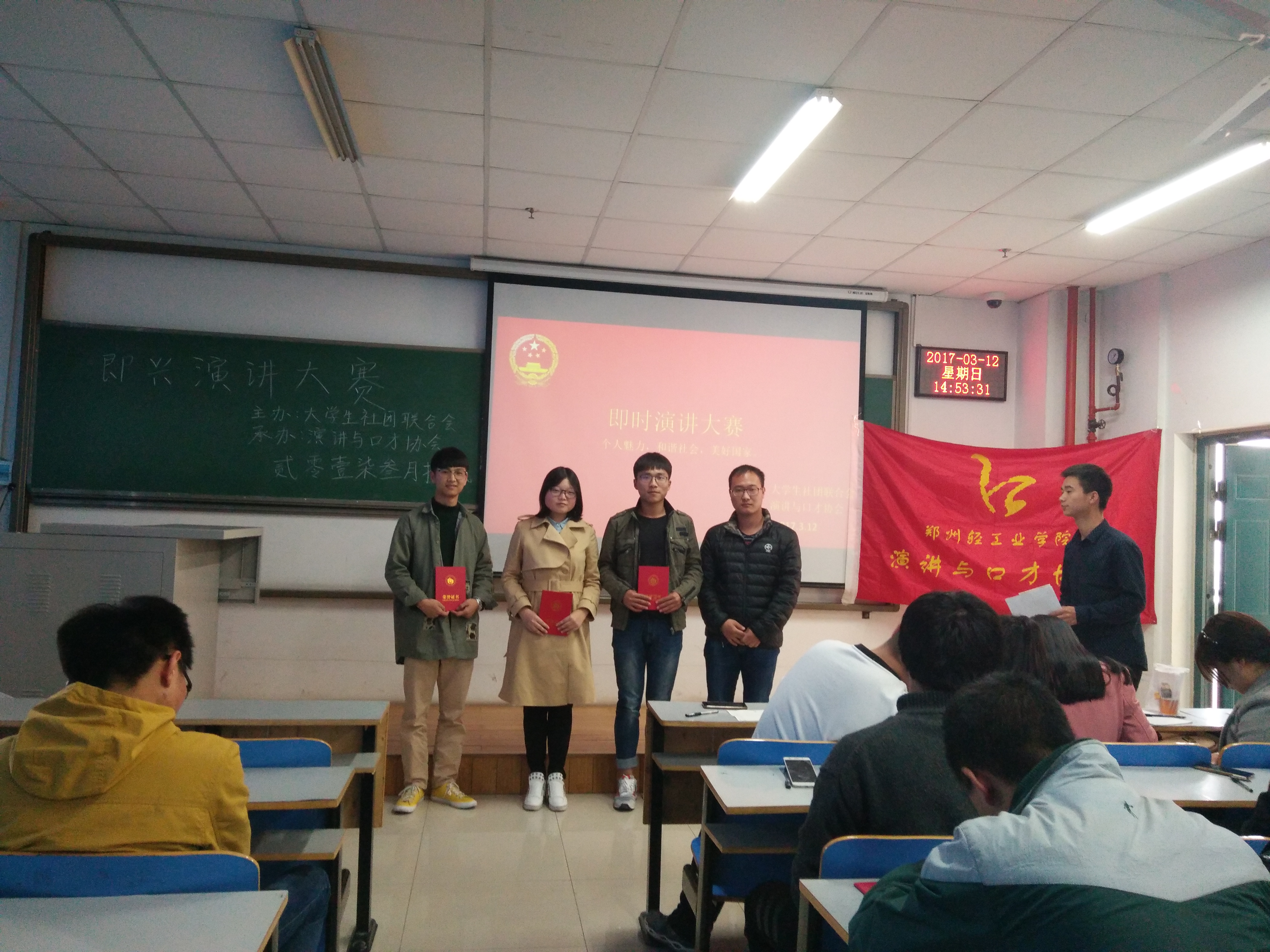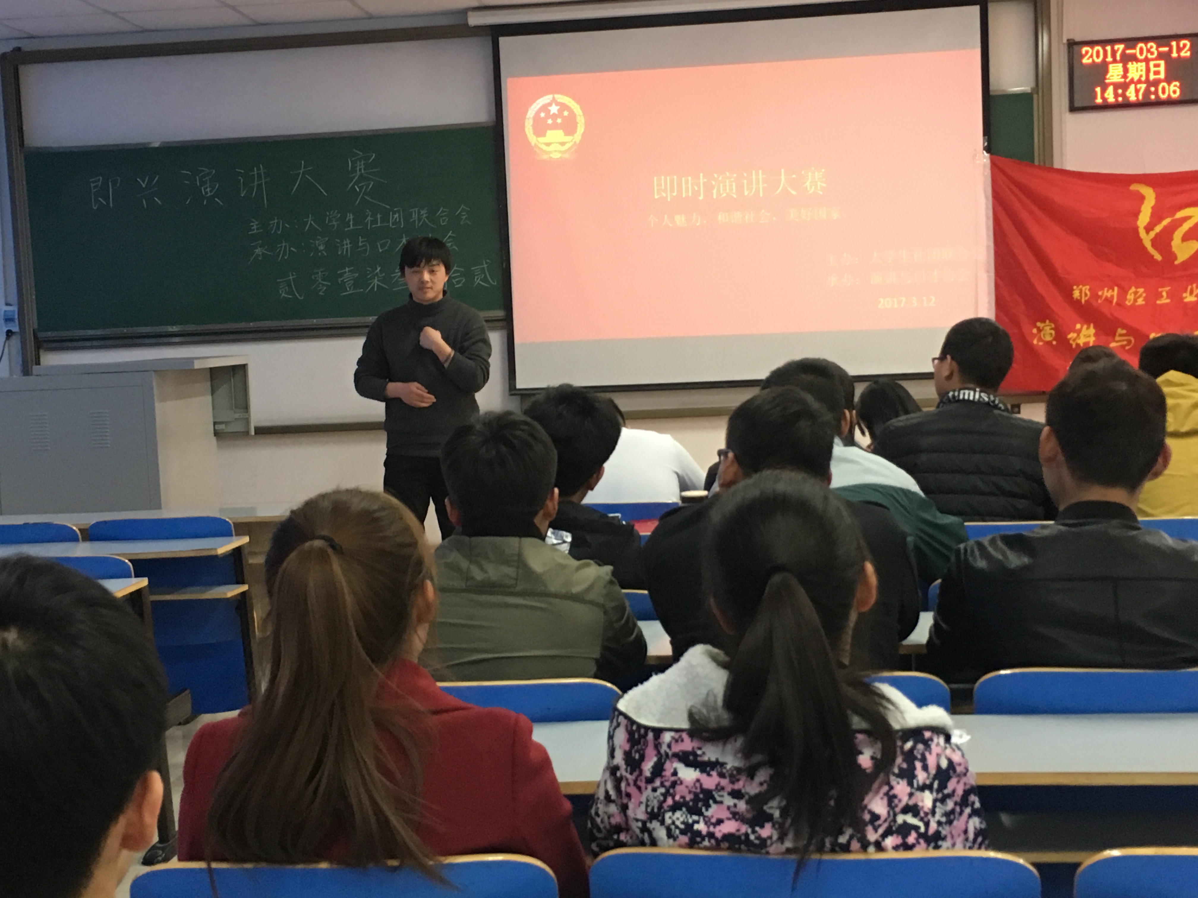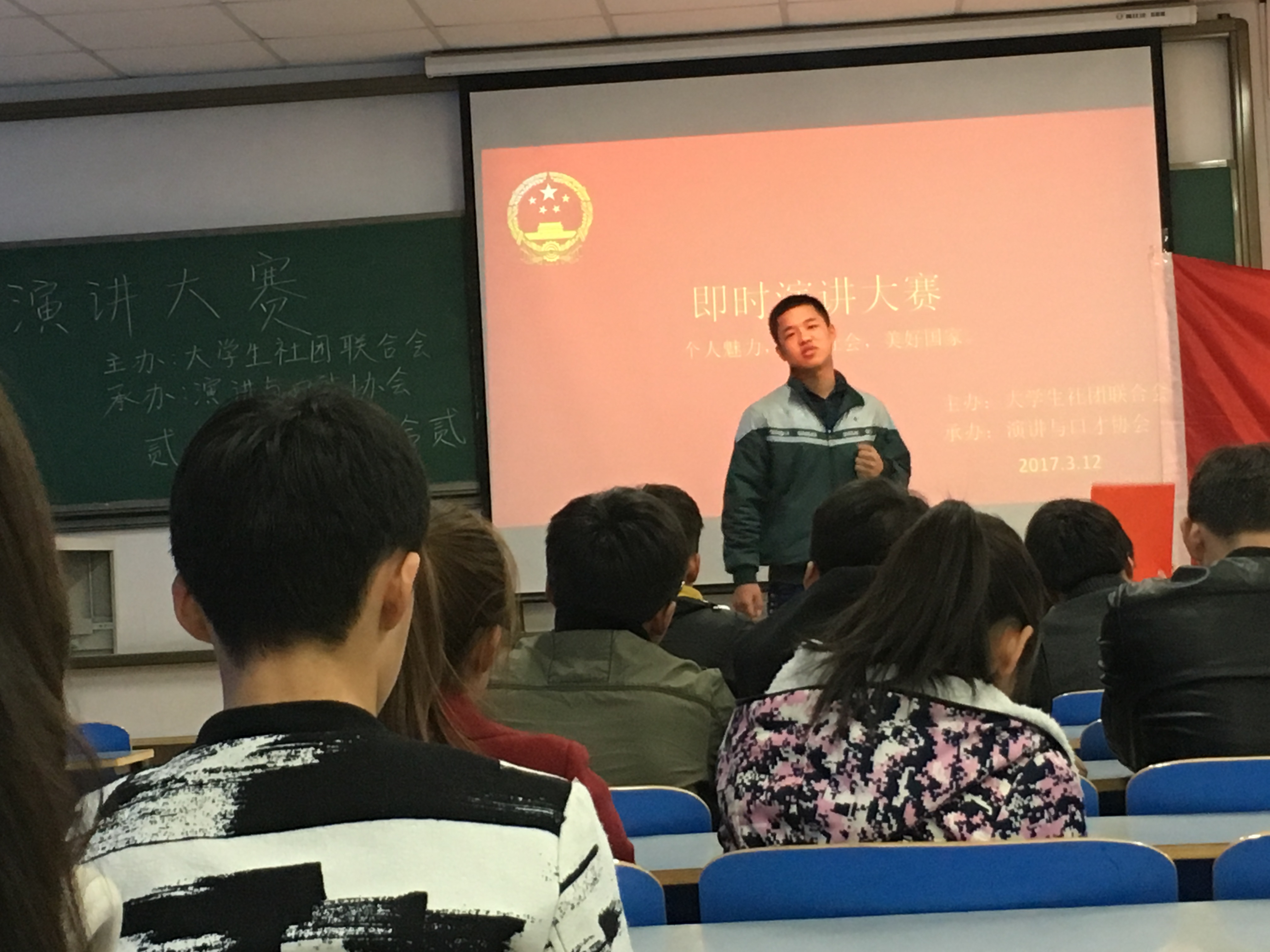 3月12日由大学生社团联合会主办,演讲与口才协会承办的即兴演讲比赛在科学校区二教楼708室召开。本次比赛是为了响应政协第十二届全国委员会第五次会议和第十二届全国人民代表大会第五次会议。出席本次比赛的嘉宾有演讲与口才协会会长郭桠骞,副会长李启蒙,秘书长夏心成等。本次比赛主持人为演讲与口才协会16级理事杜翠蓉、康保生。 本次演讲比赛以社会主义核心价值观为主题,以富强,民主,文明,和谐,自由,平等,公正,法制,爱国,敬业,诚信,友善为即兴演讲题目,共有14位选手参加比赛,选手或引经据典,或激情昂扬、幽默风趣,或妙语连珠,都一一阐述了自己对社会主义核心价值观的理解。他们发音标准,表达流畅、精神饱满,表情自然。声情并茂地演讲感染着每一位观众,现场气氛热烈,掌声不断,将活动一次次推向高潮。经过了一个半小时的激烈角逐,最终评出了一等奖一名、二等奖三名、三等奖两名以及优秀奖四名,并为获奖选手颁发了荣誉证书。演讲部部长连程程对本次演讲比赛做了精彩的点评。最后会长郭桠骞对本次比赛做了活动总结,鼓励选手们互相学习,取长补短,不断完善自我,使自己的演讲水平再上一个新台阶。最终演讲比赛在同学们的掌声中圆满结束。 本次演讲比赛有助于同学们完善自己的人生观,价值观和世界观。有利于培养同学们的综合素质,增强人际交往能力。更使同学们认识到了不论是作为公民个体,还是国家的一员,都要学习且更好地践行社会主义核心价值观,热爱祖国、诚信友善、遵纪守法、传承民族传统美德,积极投身到社会主义现代化建设及核心价值体系建设中去,为党及国家的目标奋斗、为中国梦而努力。