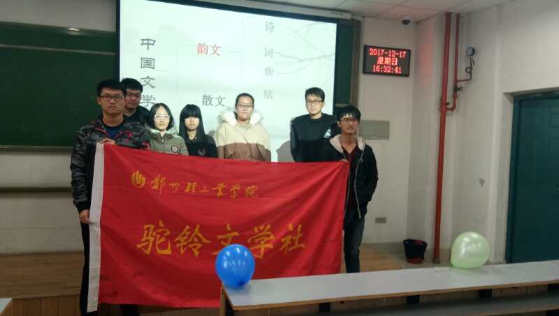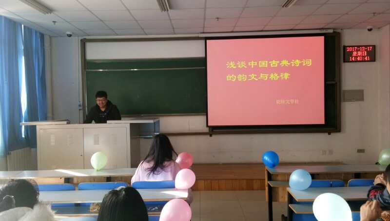 12月17日,驼铃文学社主办的古典诗词讲座在科学校区二教楼708室举行。参加讲座的包括驼铃文学社社长闫帅航、书记张林瑞、书记邓璐航、副社长张淼、副书记杜芳荣以及全体2017级新生,此次活动主持人以及主讲人由驼铃文学社会长闫帅航担任。 活动过程中,首先由驼铃文学社社长闫帅航做自我介绍,并指出古典诗词的定义和历史。他说道:1919年五四新文化运动以前产生的各种诗歌体裁形式。相对应的是现代诗歌。古典诗词是中文独有的一种文体,有特殊的格式及韵律。诗按音律分,可分为古体诗和近体诗两类。古体诗和近体诗是唐代形成的概念,是从诗的音律角度来划分的。 按内容可分为叙事诗、抒情诗、送别诗、边塞诗、山水田园诗、怀古诗(咏史诗)、咏物诗等。而后主讲人闫帅航开始以相关的文学作品作具体鉴赏,其中作品包括浪漫主义诗人李白的《行路难》、《蜀道难》、《将进酒》、《梁甫吟》等诗,以及现实主义诗人杜甫的《春望》《北征》《三吏》《三别》;另外还有宋代词人苏轼、李清照、范仲淹、辛弃疾等人的词作。最后主讲人简要介绍了元明清时期古典诗词的发展历史以及重要诗人、词人的生平和代表作品,包括于谦、龚自珍、纳兰性德、文天祥等。 该活动的举行对于驼铃文学社后期工作的开展有重要意义,它不仅是协会新老会员的又一次正式会面,而且它也加强了协会内部的成员间的团结与紧密的联系。更为重要的是,它为郑州轻工业学院同学打开了一扇文艺的大门,让更多轻院人了解到了中华民族数千年的灿烂文化。