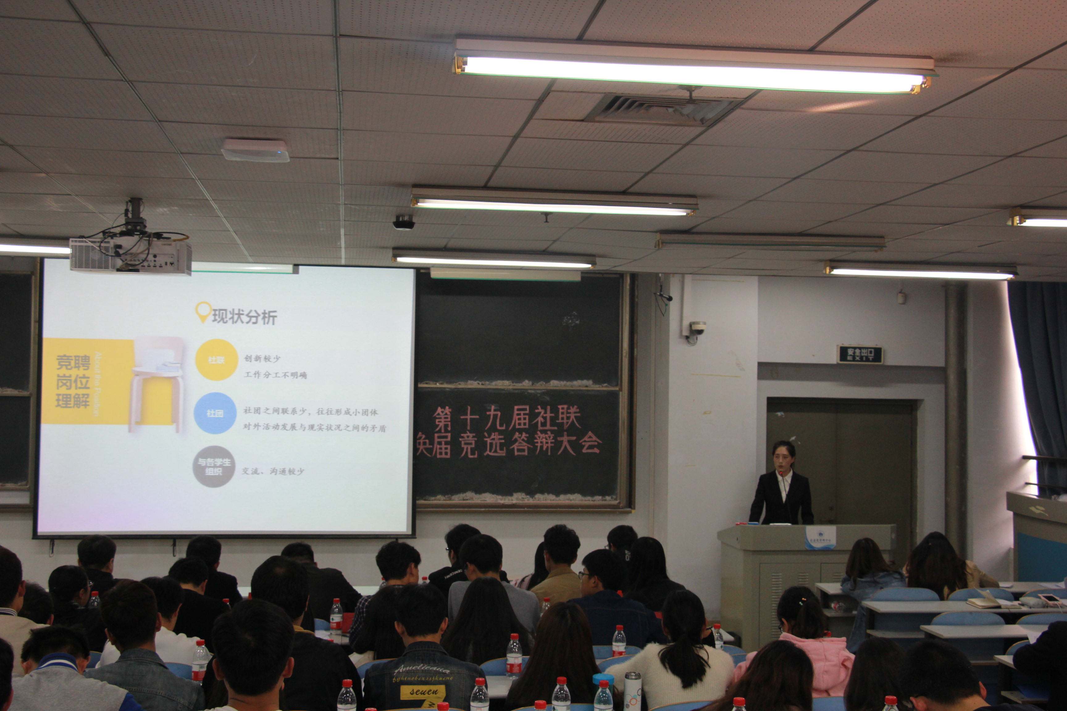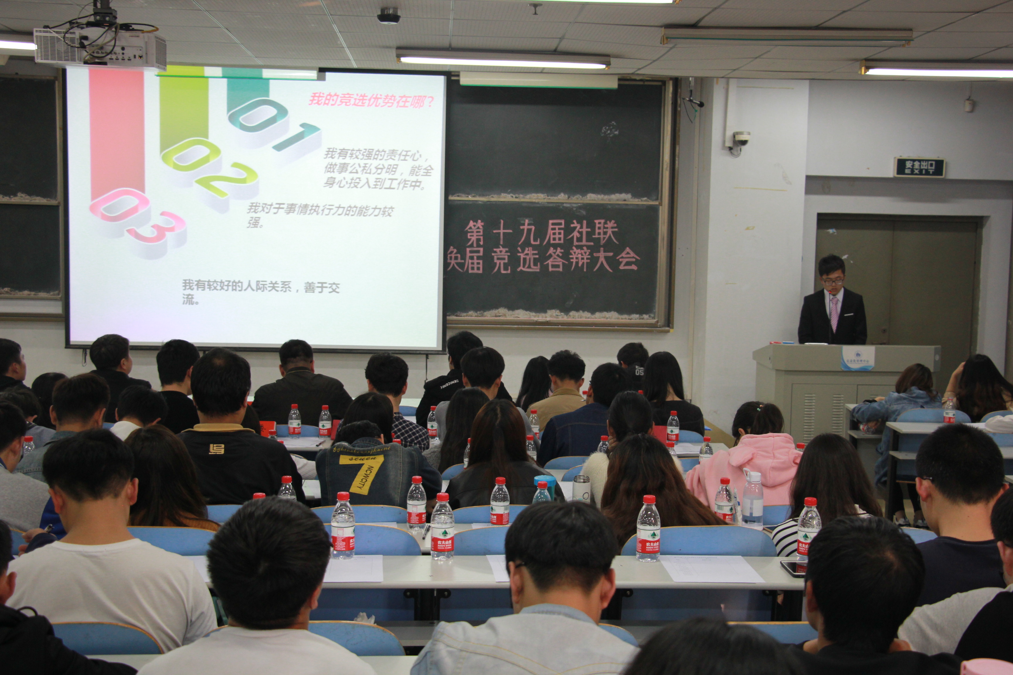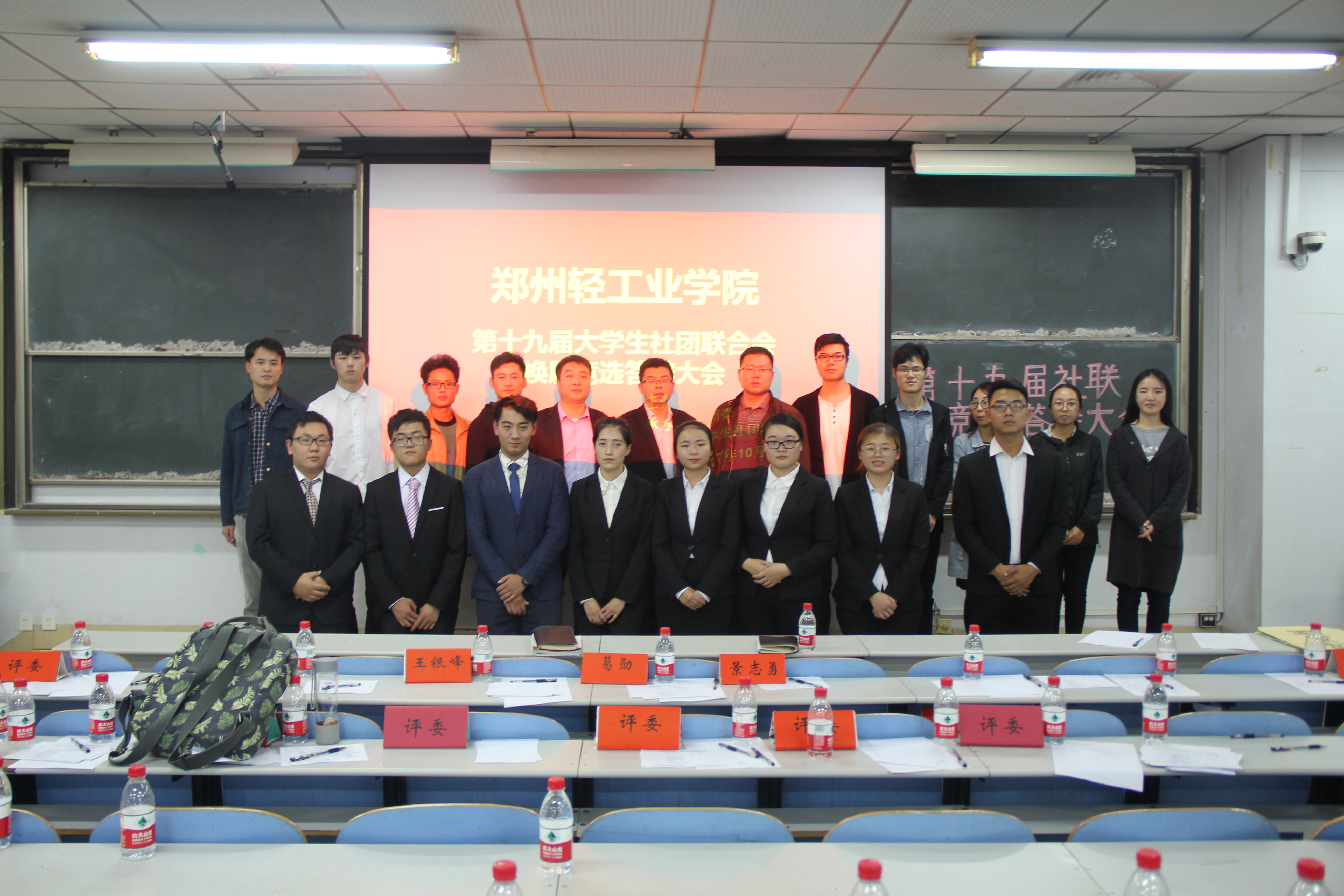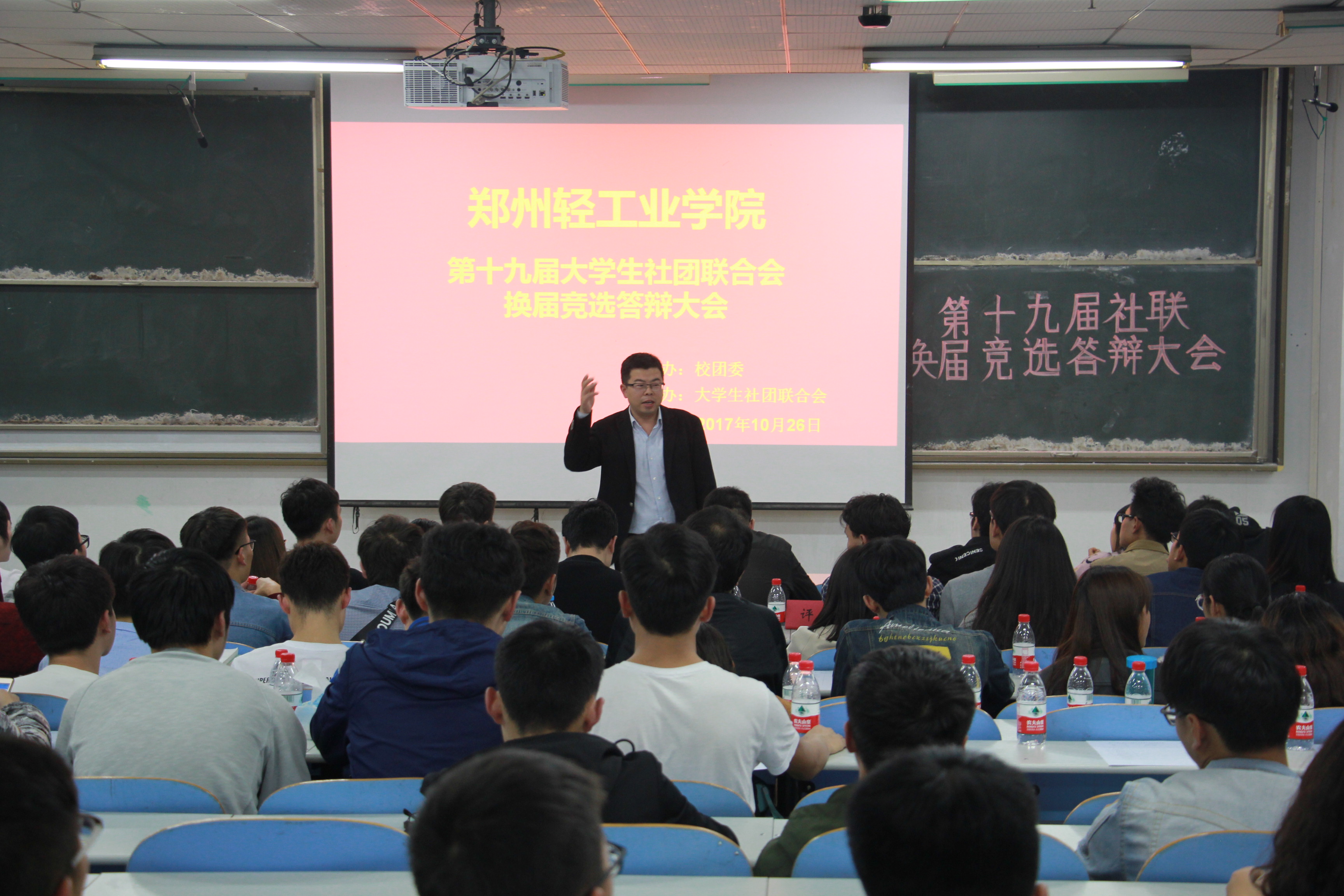 为了推动大学生社团联合会进一步发展,使社联主干力量焕然一新,10月26日,大学生社团联合会在教三楼105教室举行了第十九届大学生社团联合会换届竞选答辩大会。出席此次大会的嘉宾有校团委书记葛勋老师、校团委副书记景志勇老师和校团委办公室主任王银峰老师。担任此次大会评委的有第十八届社联团工委书记豆景坤、主席冯金宇、副书记楚丹雅、副主席郑继标和副秘书长李楠以及社联全体人员。本次换届大会不仅有学生组织代表作为评委,而且组织了各社团会长、书记参与了投票。